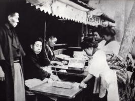 1人おいて、松露だんごを一生懸命作って作っているのが、二代目の長次です。 さすがに写真には収まっていませんが(笑) 今も現役で、だんごを作り続けている三代目は修。 で、現在は四代目の圭一が、この時代と変わらず全て一つ一つ手作りで製造いたしております。 |